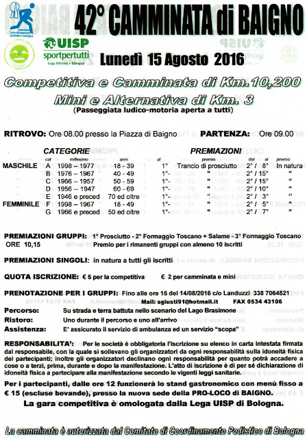 In una mattinata neanche troppo calda io e Mone abbiamo partecipato alla classicissima gara di Ferragosto a Baigno (Bo): gara collinare di 10,2 km con due belle salite con tratti in forte pendenza ma comunque sempre corribili. Molto bello il percorso caratterizzato da un passaggio dentro il borgo di Baigno e da un tratto lungo le sponde del lago Brasimone.