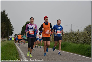 E così pure ieri, costretti a correre su stradine strette, rotte, fra buche e pozzanghere e pure un lungo tratto ghiaiato in un gruppone da una quindicina di persone che comportava più il rischio di cadere, guardare dove mettere i piedi, scansarsi a vicenda... qualche camminatore sul percorso da evitare...Avremo pure corso coperti dal vento ma personalmente ho corso malissimo. Poi l'ultimo km sul rettilineo finale si è potuto finalmente mollare i cavalli ed è iniziata una lunghissima volatona che ha delineato le posizioni e con un mille a 3'22" a tutto gas ho guadagnato il 2° posto M45 (il primo era avanti 2')... poi nel giro di pochi secondi altri 5 uno dietro l'altro. Prosciutto guadagnato. Domani a S.Patrizio giocherò in difesa, ci sarà gente che ieri si è riposata.