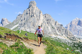 La salita è lunga e costante.....e come 5 anni fa sembra infinita.....ma poi finisce e dall'altopiano si può guardare giù con soddisfazione (Cortina avvolta da una fitta cappa di calore mentre qui sù si sta davvero bene, sole e brezza....) da qui in poi un susseguirsi di saliscendi docili con la possibilità di rifiatare e di godersi il paesaggio fino alla prima vera (divertente) discesa tecnica, come nella mia prima esperienza il fatto di aver fatto la prima parte di gara in sordina mi permette di non avere quasi nessuno a fare da tappo e quindi lanciarmi giù come un bimbo al parco giochi. Mi accorgo ben presto però (ma lo sapevo...) che le "ferite di guerra" dell'UTVD non sono per niente guarite del tutto e le punte dei piedi nonostante il solito trattamento certosino di fasciatura, "cremazione" ed incerottatura già da qui cominciano a dolere....lo prendo come un segno di allerta e rallento un po' (del resto l'altra volta a fine discesa avevo le gambe dure e la successiva salita mi ha regalato crampi che mi han rallentato tanto da non superare il cancello orario).....devo ragionare, questa volta sono qui per finirla e basta.